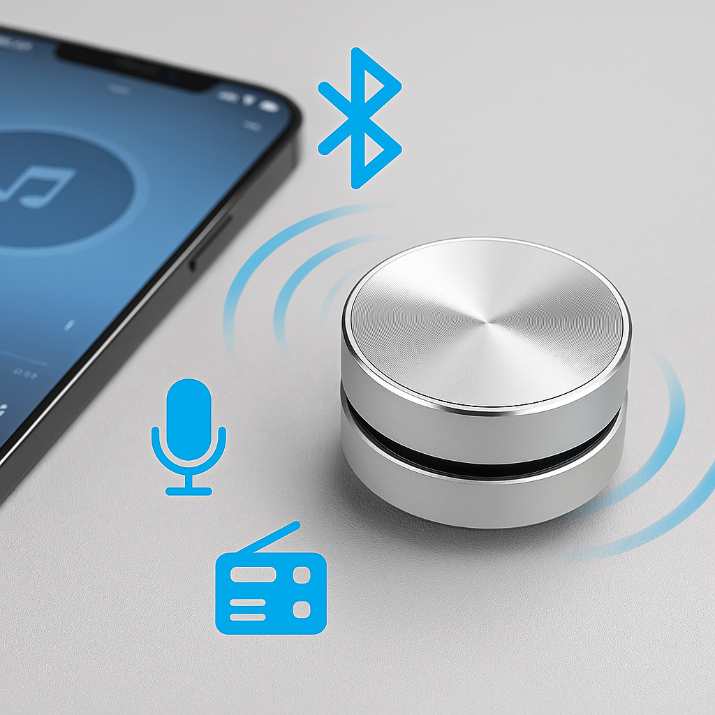 Despite its small size (only 4 cm wide), TapTune can reach up to 115 dB when placed on the right surface — about 4–5 × louder than a standard smartphone speaker.